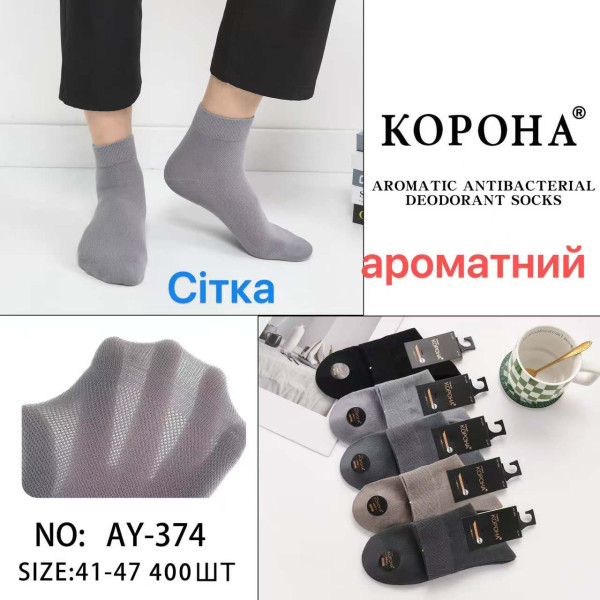 Чоловічі шкарпетки КОРОНА AY-374 — це ідеальне рішення для спекотної літньої погоди, що поєднує в собі вентиляцію та гігієну. Модель виконана зі спеціальною структурою «сітка» по всій поверхні, що забезпечує максимальну циркуляцію повітря та запобігає перегріву стопи. Завдяки технології «Aromatic Antibacterial Deodorant», шкарпетки мають приємний аромат та перешкоджають розмноженню бактерій і появі неприємного запаху. Висока якість трикотажу гарантує комфортну посадку та стійкість до зношування.