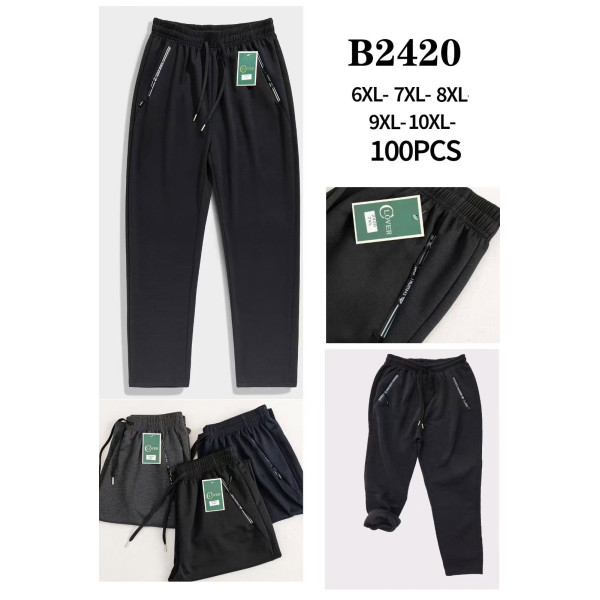 Чоловічі спортивні штани B2420 виготовлені з якісного трикотажу, приємного до тіла та практичного у носінні. Модель з кишенями на блискавці та зручним поясом на резинці зі шнурком. Підходять для щоденного використання та активного відпочинку. Батальні розміри: 6XL, 7XL, 8XL, 9XL, 10XL. Упаковка: 100 штук.
