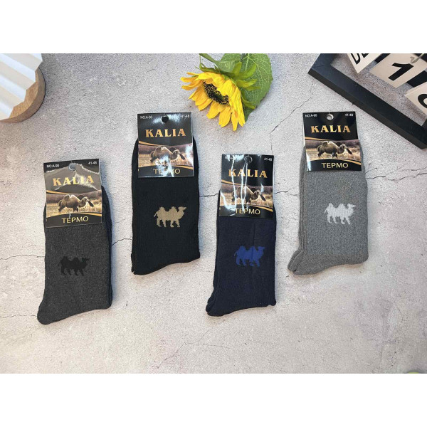 Чоловічі термошкарпетки KALIA (Артикул N0/A-90). Модель призначена для носіння у холодну пору року, має високу посадку та посилену п'яту. Склад матеріалу забезпечує терморегуляцію та відведення вологи. Наявність вовни (імітації верблюжої) дає гарантоване тепло. Розмірний ряд: 41-48 (універсальний). ОПТ: пачка 12 пар (мікс кольорів).