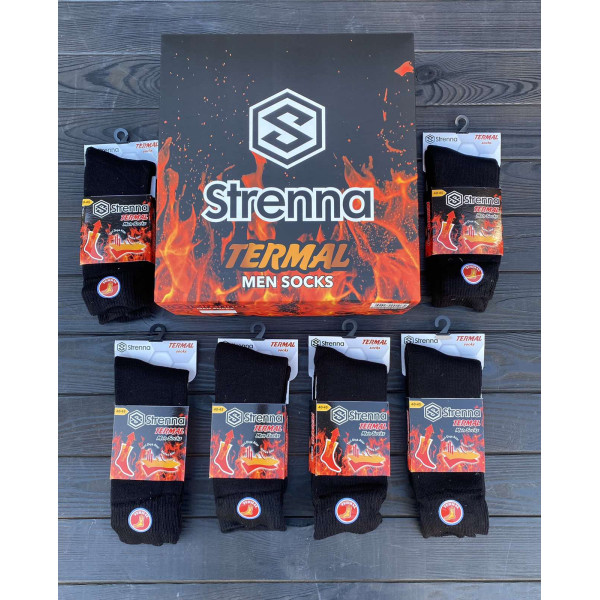 Термоноски Strenna для чоловіків створені для комфорту у холодну пору року. Виготовлені з якісного матеріалу, вони добре утримують тепло, при цьому дозволяють шкірі дихати. Мають еластичну резинку, яка не перетискає ногу, забезпечуючи зручність протягом усього дня. Оптимальний варіант для щоденного використання, роботи на вулиці чи активного відпочинку. Доступні у класичному чорному кольорі. Розмір універсальний — 40–45. Упаковка — 12 пар.