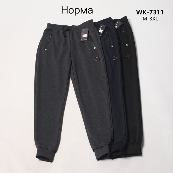 Чоловічі трикотажні штани WK-7311. Розміри M–3XL. Зручна модель з манжетами, кишені на блискавках, пояс на резинці. Упаковка 5 штук, один колір.