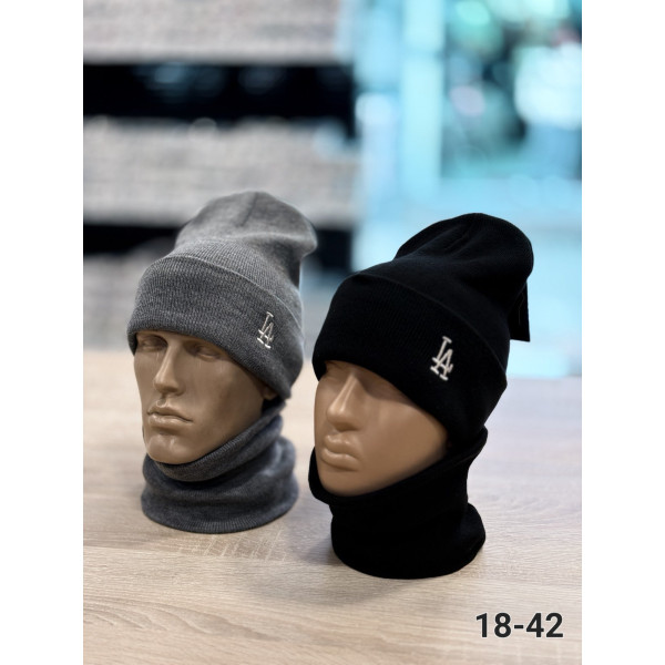 Чоловічий Набір Шапка Біні + Хомут (Снуд). Класична в'язка, з нашивкою. Демісезон/Зима. Розмір універсальний. Продаж ОПТОМ. Opt7km.