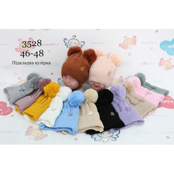 Дитячі шапки модель 3528 виконані з теплого в’язаного трикотажу. Прикрашені двома пухнастими помпонами, які роблять образ милим та стильним. Усередині — м’яка підкладка кулірка, що забезпечує комфорт і захист від холоду. Розмір: 46–48. Є різні кольори на вибір.