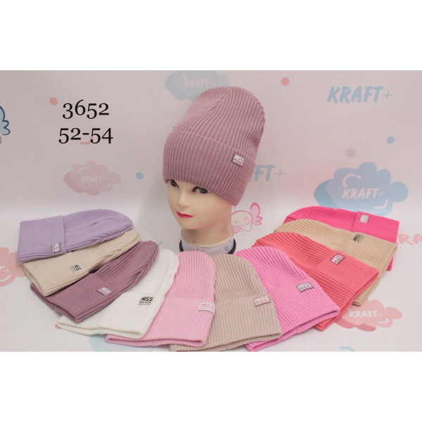 Шапка 3652 виконана з м’якої пряжі в одинарній в’язці. Модель має еластичну структуру, що добре тягнеться та зручно сидить на голові. Прикрашена невеликою нашивкою «Miss Cute», яка додає сучасного стилю. Підійде для демісезонного періоду. Представлена в різних кольорах: білий, бежевий, рожевий, ліловий, персиковий, малиновий, фіолетовий та інші. Розмір: 52–54 см. Упаковка: 5 шт.