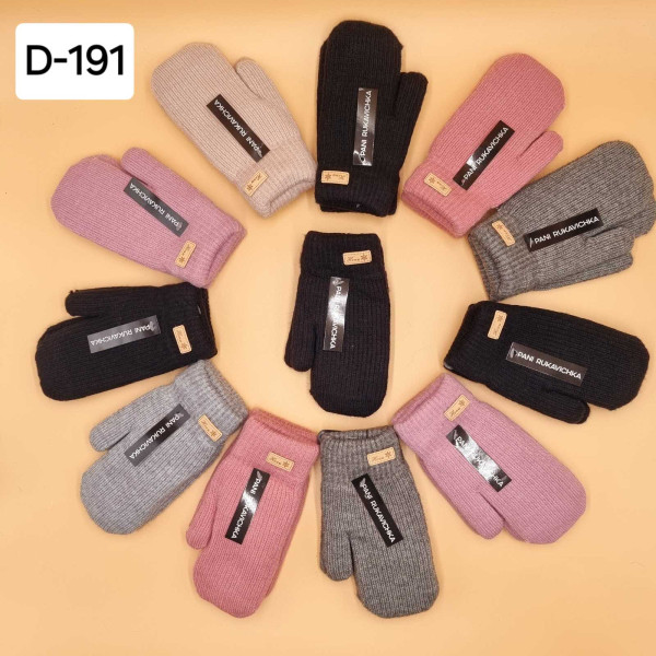 Дитячі рукавички, артикул D-191. Подвійна в’язка забезпечує тепло та комфорт у холодну погоду. Довжина 19–20 см — добре підійде для старших дітей. Упаковка містить 12 пар у різному кольоровому міксі. Модель поєднує практичність і стиль.