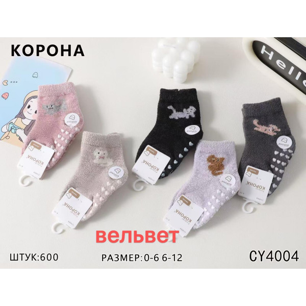 Дитячі шкарпетки КОРОНА CY4004 виготовлені з м’якого вельвету. Усередині приємні до тіла, добре тримають тепло та не викликають подразнень. Декоровані милими малюнками тваринок. На підошві — антиковзні силіконові вставки у вигляді сердечок, що робить їх безпечними для малюків. Упаковка — 600 шт. Розміри: 0–6 міс, 6–12 міс.