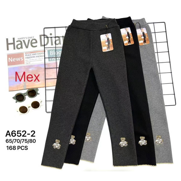 Дитячі лосини A652-2 виготовлені з еластичного трикотажу в рубчик, утеплені м’яким хутром. Мають високий пояс, зручні у носінні та добре гріють у холодну погоду. Прикрашені милим вишитим ведмедиком унизу штанини. Доступні у різних кольорах: чорний, темно-сірий, світло-сірий. Розміри 65/70/75/80. В упаковці — 168 шт.
