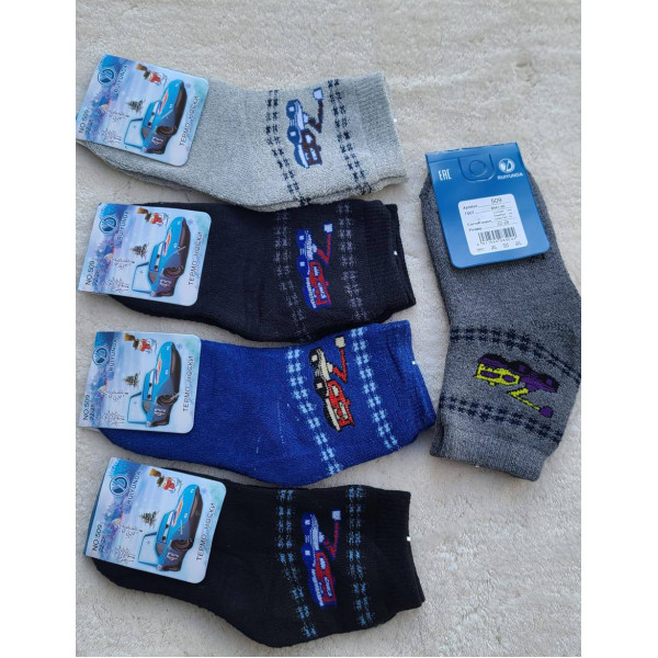 Дитячі махрові носки для хлопчика – забезпечують максимальне тепло та комфорт ніжкам. Утеплення: внутрішня сторона носка повністю покрита м'якою, густою махрою (начіс). Розмір: 2-4 роки (підходить на розмір взуття приблизно 22-25). Пакування: один розмір в упаковці, що зручно для оптового продажу. Дизайн: зазвичай, яскраві кольори та малюнки (машинки, смужки, звірята). Висока якість та зносостійкість. Сезон: Осінь/Зима