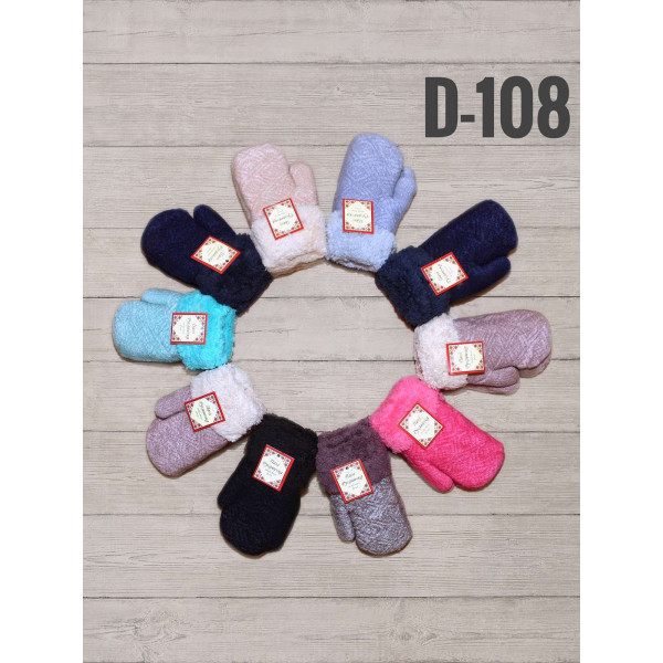 Дитячі варежки, артикул D-108. Подвійна в’язка з утепленим внутрішнім шаром гарантує тепло та комфорт навіть у сильний холод. Вироби м’які на дотик, приємні до шкіри, представлені у різному кольоровому міксі. Розраховані на дітей віком 5–7 років. В упаковці 10 пар.