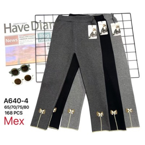 Дитячі зимові лосини A640-4 виконані з трикотажу в рубчик, утеплені м’яким хутром. Висока талія забезпечує зручність і тепло, модель добре сідає по фігурі. У нижній частині штанин є декоративні бантики з кантовкою, що додає виробу ніжного та святкового вигляду. Кольори: чорний, темно-сірий, світло-сірий. Розміри — 65/70/75/80. В упаковці — 168 шт.