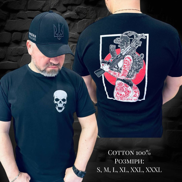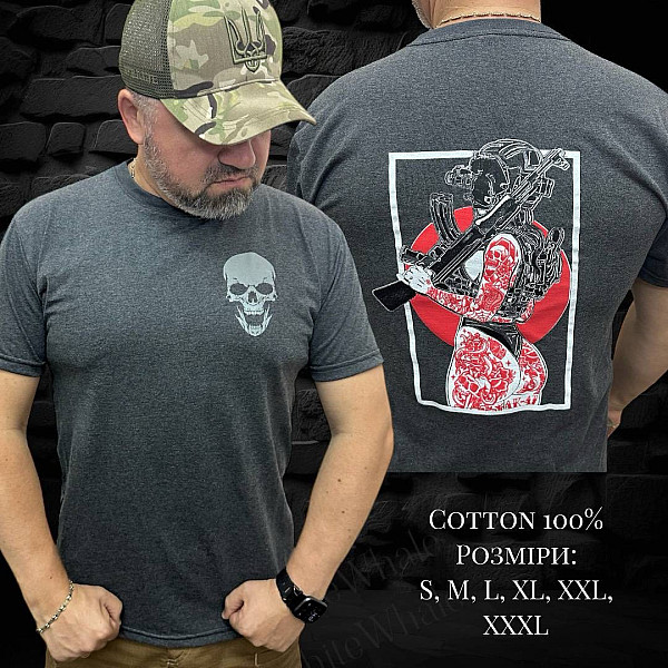 Футболка патріотична «ДІВЧИНА З АВТОМАТОМ» АНТРАЦИТ Артикул: Т-240556 Склад: котон 100% Розміри: S, M, L, XL, XXL, XXXL