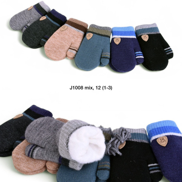 Купити дитячі подвійні варежки на вік 1-3 роки оптом. Подвійний шар тепла, гіпоалергенна нитка, надійна фіксація. Упаковка 12 пар. Код: J1008. Вигідно на OPT7KM.