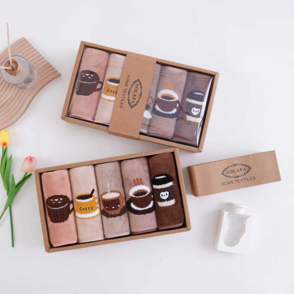 ОПТ! Купити оптом набори рушників SOLAFA (5 шт) 35x72 см [дані із запиту користувача] з мікрофібри [дані із запиту користувача]. Рушники з милими кавовими принтами запаковані у подарункову коробку. Ідеально для подарунка.