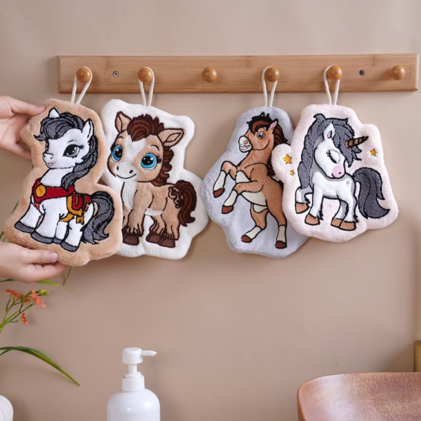 Набір дитячих рушників «Рік Коня» (Арт. 0312-900, ОПТОМ). Симпатичні та м'які рушники для рук та обличчя. Ідеально підходять для дитячого садка, школи або будинку. Особливості: * Матеріал: М'який, пухнастий матеріал (імовірно, мікрофібра або плюш). * Дизайн: Яскраві мультяшні малюнки коней/єдинорогів. * Функціонал: Оснащені зручною петелькою для підвішування. Умови Опту: Продаж оптом пачками по 12 шт. [дані користувача]. Вигідні оптові ціни від Opt7km!