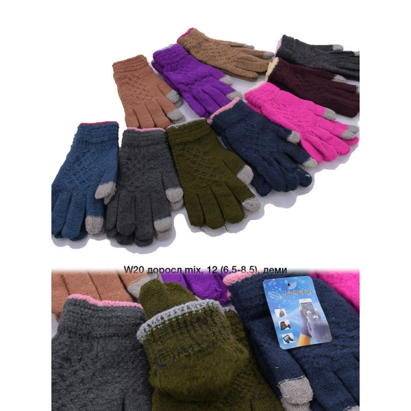 ОПТ! Купити оптом жіночі сенсорні рукавички (Код W20). Модель одинарна, універсальний розмір. Дозволяють користуватися смартфоном. Пакування: 12 пар. Мікс базових кольорів.