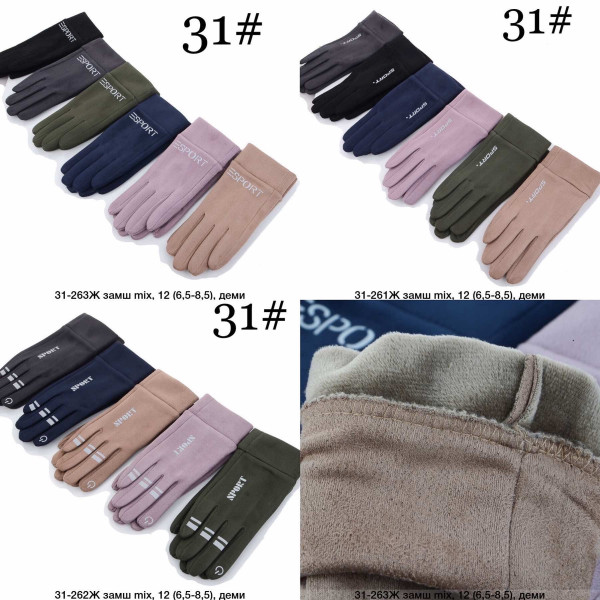 ОПТ! Жіночі сенсорні рукавички "Замша/Плюш" (Код 31#). Ідеальна модель для осінньо-зимового періоду, що поєднує елегантний зовнішній вигляд та сучасні технології. Рукавички виготовлені з якісної еко-замші та мають теплу внутрішню плюшеву підкладку, що робить їх комфортними для демісезону. Основна перевага — сенсорні пальці, що дозволяють користуватися смартфоном без зняття аксесуара. Розмір 6.5-8.5 (стандартний жіночий). Упаковка містить 12 пар у міксі ходових кольорів (чорний, коричневий, хакі, сірий, рожевий). Вигідна оптова пропозиція.