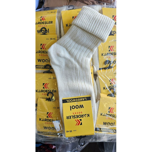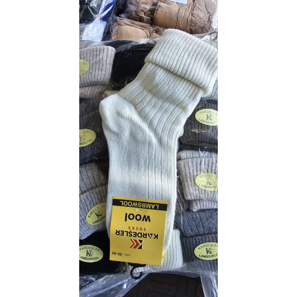 ОПТ! Жіночі зимові шкарпетки KARDESLER LAMBSWOOL (Розмір 36-41). Незамінний теплий аксесуар для зимового асортименту. Шкарпетки виготовлені з високоякісної пряжі з високим вмістом вовни ягняти (Lambswool) — 80%, що гарантує виняткове тепло та м'якість. Додавання поліаміду та еластану (15% ПА, 5% Еластан) забезпечує еластичність, зносостійкість та ідеальну посадку на нозі. Розмірний ряд 36-41 є універсальним для дорослих жінок. Модель має високий паголенок та теплу (ймовірно, махрову) в'язку. Товар продається міксом класичних кольорів: білий, бежевий, сірий, чорний.