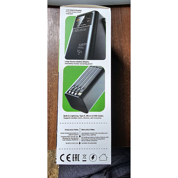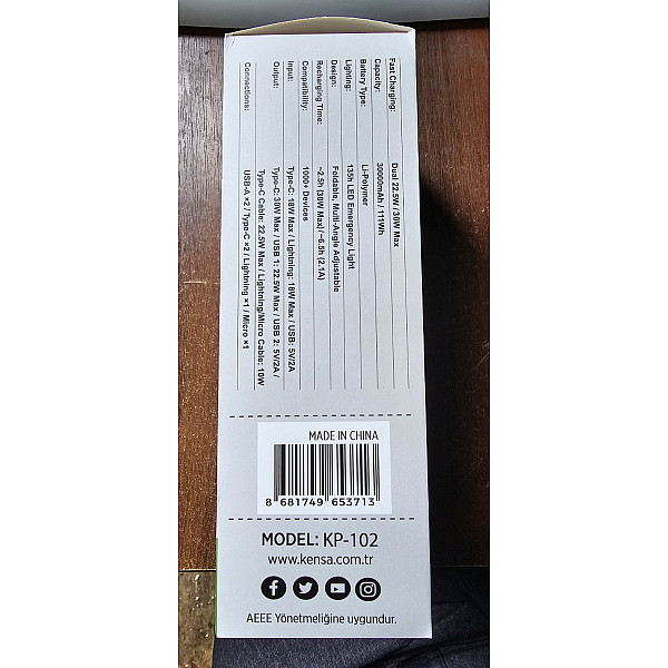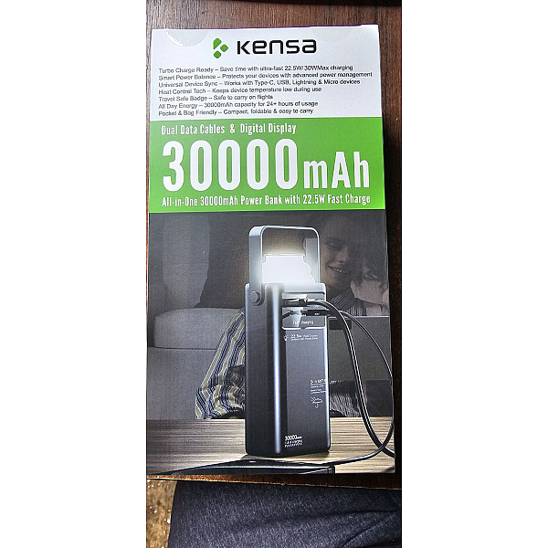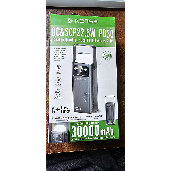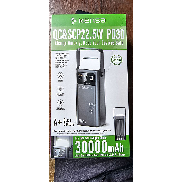 Kensa 30000mAh — це високоефективна зарядна станція у вашій кишені. Завдяки величезній ємності та підтримці протоколів швидкої зарядки PD 30W та QC 22.5W, цей пристрій здатний швидко зарядити не тільки смартфон, а й планшет. Головна особливість моделі — 3 вбудовані кабелі (Type-C, Lightning, Micro-USB), що позбавляє необхідності носити дроти з собою. Повербанк оснащений яскравим LED-ліхтарем (Camping Lamp), що робить його незамінним для відпочинку на природі або під час відключень світла. Корпус має зручну ручку для перенесення та цифровий дисплей.