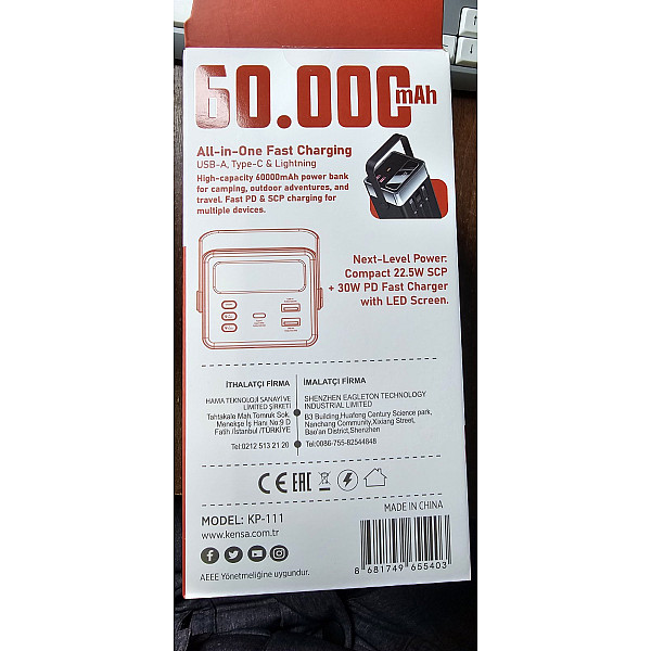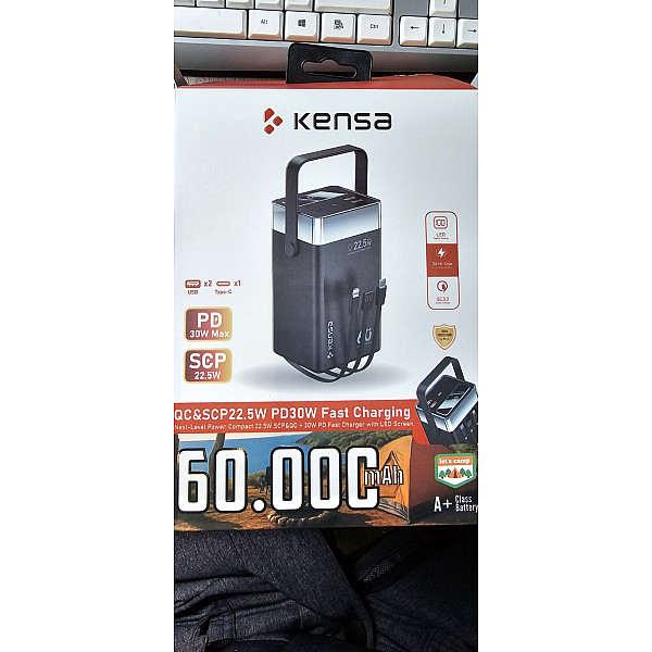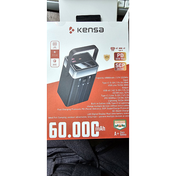 Kensa 60000mAh — це справжня мобільна електростанція, створена для тих, кому потрібна максимальна автономність. Завдяки значній ємності, він ідеально підходить для тривалих подорожей, кемпінгу або тривалих блекаутів. Пристрій підтримує найсучасніші стандарти швидкої зарядки: PD 30W Max та SCP 22.5W, що дозволяє швидко заряджати навіть енергоємні гаджети. Модель оснащена трьома вбудованими кабелями (Type-C, Lightning, Micro-USB), зручним ремінцем для перенесення та потужним LED-ліхтарем для використання в польових умовах.