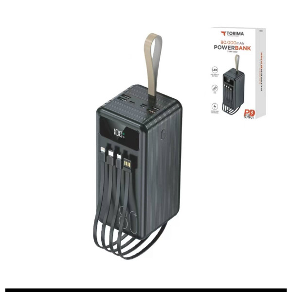 Powerbank TORIMA TRM-1080 80 000 mAh — потужний акумулятор з LED-дисплеєм, швидкою зарядкою 22.5W та вбудованими кабелями. Ідеально для дому, поїздок та аварійних відключень електроенергії.