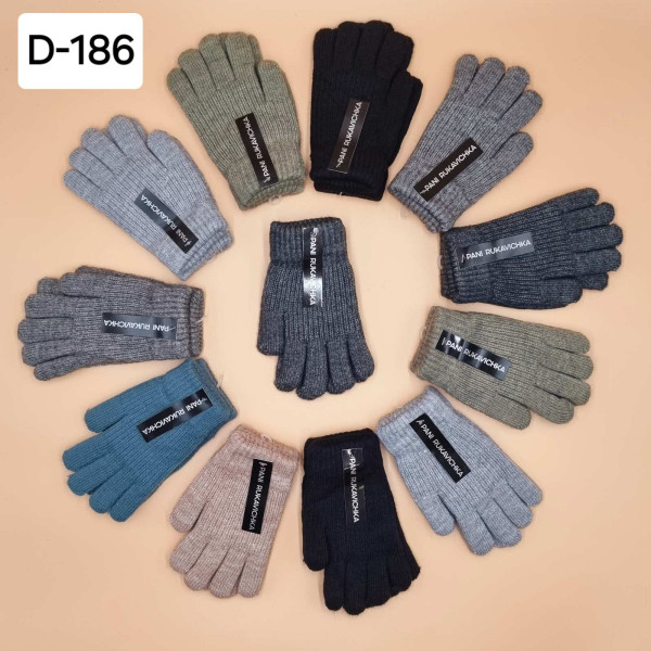 Дитячі рукавички Арт D-186. Подвійна в’язка забезпечує тепло та комфорт у холодну погоду. Довжина 16–17 см — зручний розмір для дітей молодшого шкільного віку. В упаковці 12 пар у різних кольорах.
