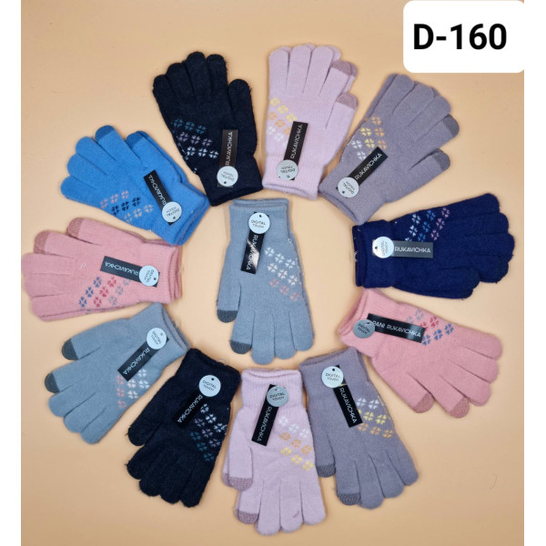 Підліткові рукавички Арт D-160, виготовлені з теплого трикотажу. Довжина 19 см, зручні та практичні для повсякденного використання. Мають візерунок у вигляді сніжинок і сенсорні вставки на пальцях. Упаковка — 12 пар у різному кольоровому міксі.