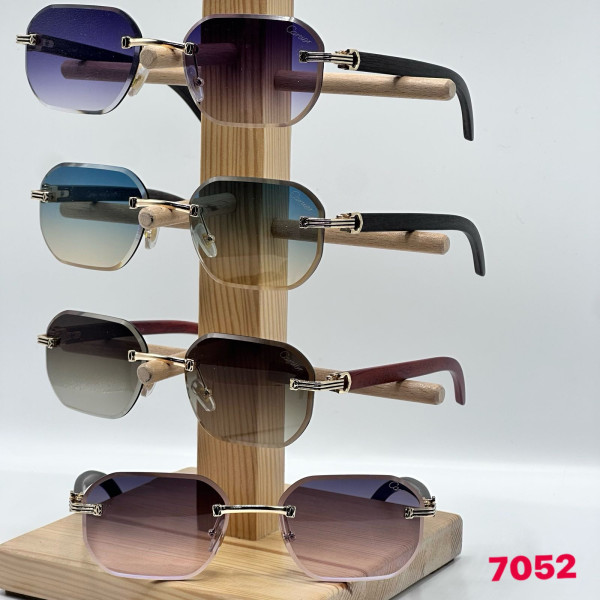 Модель 7052 — це поєднання класичної розкоші та природних матеріалів у стилі легендарного бренду Cartier. Безоправна конструкція з прямокутними лінзами, що мають м'яко закруглені краї, створює інтелігентний та дорогий образ. Головна особливість моделі — масивні дужки, виконані з темного або червоного дерева (або високоякісної імітації фактури дерева) з фірмовими золотистими вставками-«дужками». Лінзи з градієнтним напиленням забезпечують винятковий комфорт та надійний захист від сонячних променів.