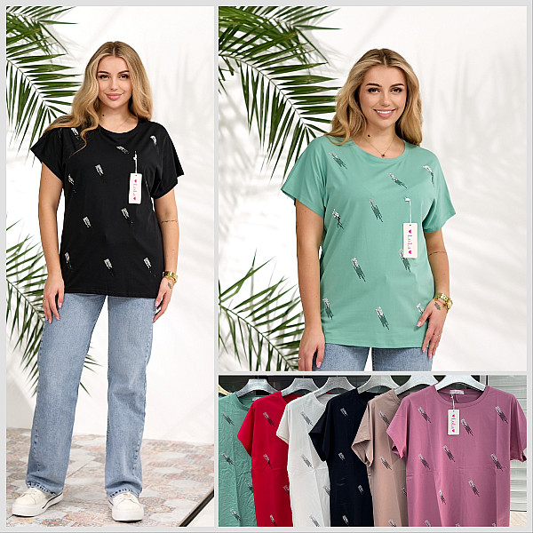 Жіноча футболка з абстрактним принтом та стразами, універсальний розмір 52-54, мікс кольорів, від 1 упаковки (10 шт.)