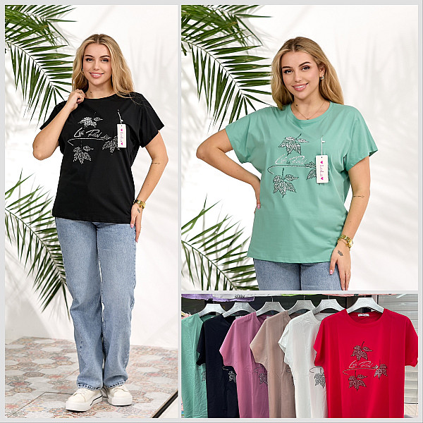 Жіноча футболка з малюнком «Листя» та стразами, універсальний розмір 52-54, мікс кольорів, від 1 упаковки (10 шт.)