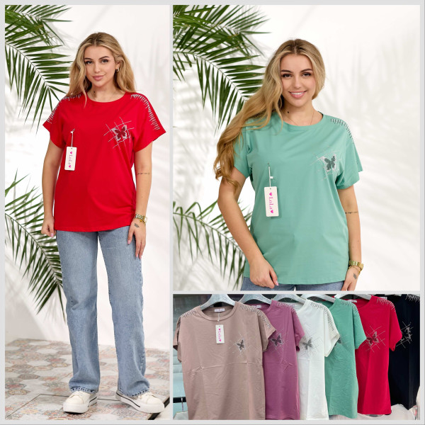 Жіноча футболка з малюнком «Метелик» та стразами, універсальний розмір 52-54, мікс кольорів, від 1 упаковки (10 шт.)