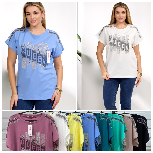 Жіноча футболка зі стразами «QUEEN», універсальний розмір 50-54, мікс кольорів, від 1 упаковки (10 шт.)
