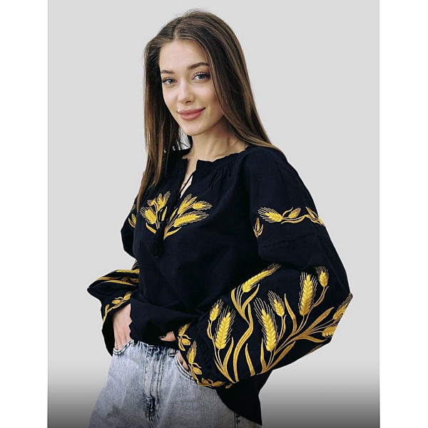 Стильна жіноча вишиванка в сучасному виконанні — ідеальний вибір для створення виразного образу з національним колоритом. Поєднання глибокого чорного кольору тканини та яскравої жовтої вишивки пшеничних колосків виглядає шляхетно та актуально. Натуральний льон забезпечує комфорт та відмінну терморегуляцію.