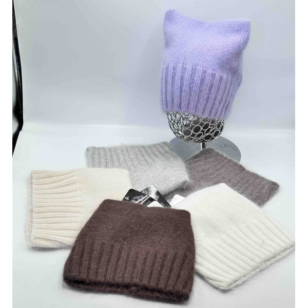 Жіноча шапка з ангори з вушками, подвійна. М'яка, тепла, приємна на дотик. Колір — мікс. Опт від 5 шт.