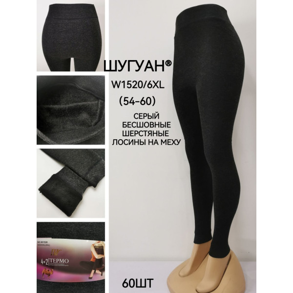 Жіночі зимові лосини Шугуан W1520/6XL — теплі та зручні завдяки вовняному складу та хутру всередині. Безшовна технологія забезпечує щільну посадку без натирання, а еластичний матеріал добре тягнеться та комфортно сідає на фігуру. Сірий колір універсальний, підходить під будь-який гардероб. Батальний розмір 54–60. В упаковці 60 шт.