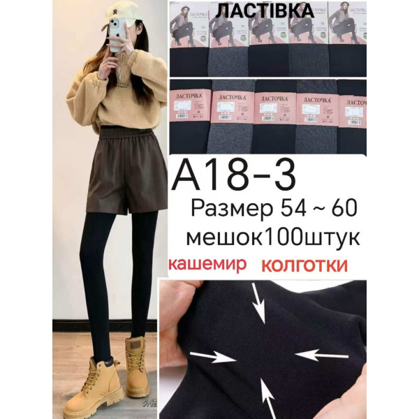 Ластівка A18-3 — це жіночі кашемірові колготки у супербатальних розмірах (54–60). Вони створені для максимальної зручності та тепла в холодний сезон. Щільний матеріал добре тягнеться, не сковує рухів і зберігає тепло. Колготки еластичні, приємні до тіла, підходять для щоденного носіння. Упаковка — 100 шт.