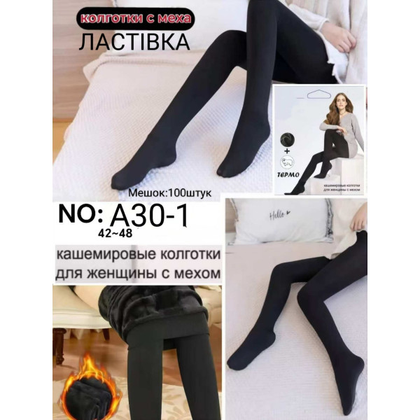 Ластівка A30-1 — це зимові жіночі колготки із кашеміру з теплим хутром усередині. Вони забезпечують комфорт і тепло навіть у сильні морози, завдяки щільній та еластичній тканині добре сідають по фігурі. Ідеально підходять для повсякденного використання та створення стильного зимового образу. Розміри: 42–48. Упаковка — 100 шт.