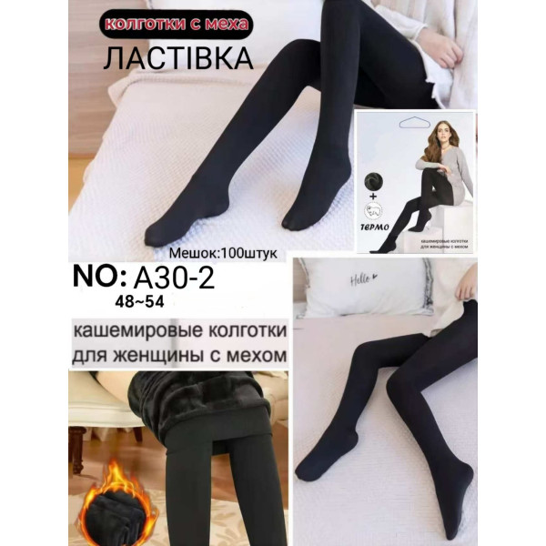 Ластівка A30-2 — це зимові жіночі батальні колготки з кашеміру з теплим внутрішнім хутром. Вони відрізняються високою еластичністю, добре сідають по фігурі та забезпечують максимальний комфорт у холодну погоду. Щільна тканина захищає від вітру й морозу, при цьому залишається приємною на дотик. Розміри: 48–54. Упаковка — 100 шт.