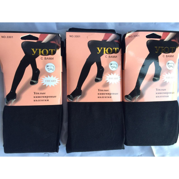 Жіночі теплі колготки (бренд "УЮТ", артикул NO.3301), призначені для великих розмірів (Гігант). Виготовлені з якісного матеріалу з додаванням кашеміру (найтепліший різновид ворсу), що забезпечує максимальний комфорт і тепло. Колготки мають посилену щільність, високу посадку та добре облягають фігуру. Розмір: 56-62 (Гігант/Батал). ОПТ: пачка 10 штук, усі одного розміру, але різних кольорів (як показано на фото).