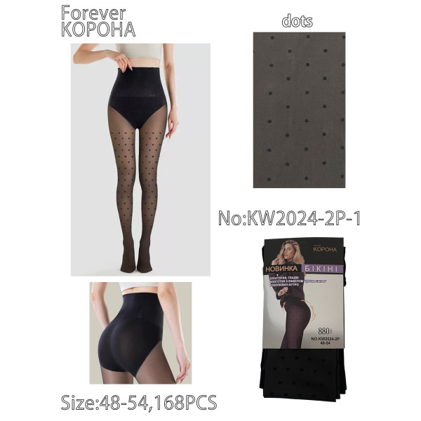 Жіночі колготки Forever КОРОНА KW2024-2P-1 з малюнком “dots”. Еластичні, гладкі, з високою талією та ефектом підтяжки. Розмір: 48–54. В упаковці — 168 шт.
