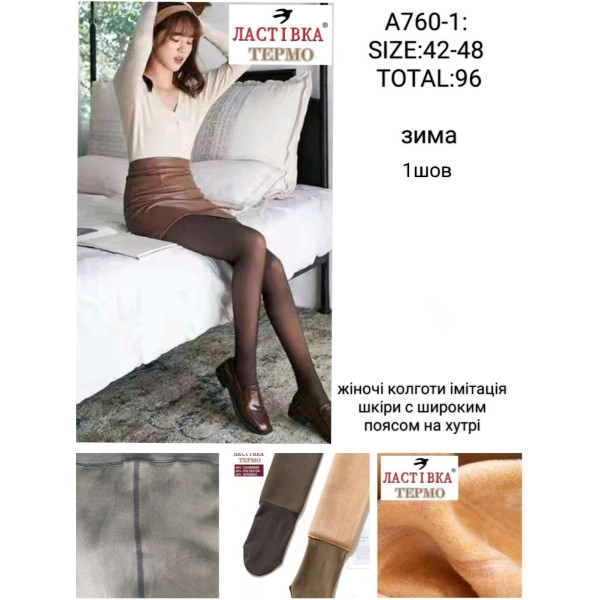 Ластівка A760-1 — це стильні жіночі зимові колготки з ефектом імітації шкіри. Внутрішня підкладка на теплому хутрі забезпечує комфорт і захист від холоду. Широкий пояс добре фіксується на талії, не сповзає й створює зручну посадку. Колготки з одним швом, еластичні та щільні, підходять для холодної пори року. Розміри: 42–48. Упаковка — 96 шт.