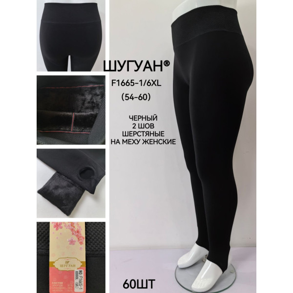Жіночі легінси ШУГУАН F1665-1. Батальні розміри 54–60 (6XL). Чорні, на хутрі, теплі, з двома швами. Упаковка — 60 шт.