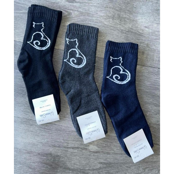 Жіночі махрові шкарпетки прикрашені милим малюнком кота у вигляді силуету з хвостиком-сердечком. Виготовлені з м’якого махрового матеріалу, вони чудово утримують тепло та створюють максимальний комфорт у холодну пору року. Еластичний верх щільно фіксує шкарпетку на нозі, не здавлюючи її. Розмір 36–41 універсальний, підходить більшості жінок. Доступні у класичних кольорах: чорний, сірий, темно-синій.