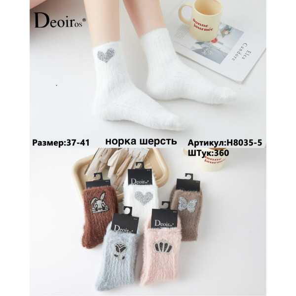 Шкарпетки жіночі Deoiros H8035-6 виготовлені з пухнастої норкової шерсті, що надає особливу м’якість і тепло. Мають стильний дизайн з об’ємними нашивками у вигляді ведмедика, зірки, сердечка, усміхненого смайлика чи силуету Міккі. Завдяки еластичній резинці добре фіксуються на нозі, не тиснуть і зручні у щоденному носінні. Доступні кольори: чорний, білий, сірий. Розмір 37–41. Упаковка — 360 шт.