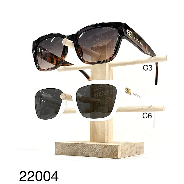 Balenciaga 22004 — це сміливе поєднання футуристичного стилю та класичної елегантності. Модель має виразну прямокутну оправу із акцентованими широкими дужками. Головною особливістю дизайну є великий об'ємний золотистий логотип BB на скронях, що підкреслює впізнаваність бренду.