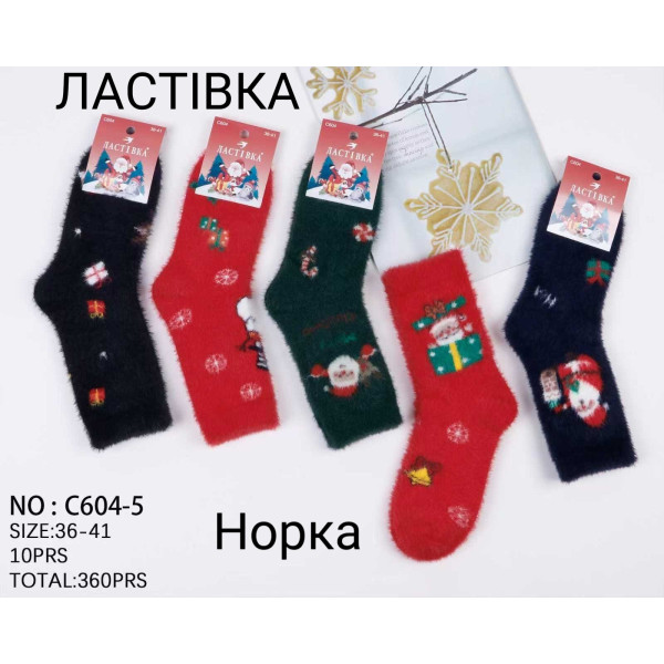 Жіночі зимові шкарпетки Ластівка C604-5 виготовлені з м’якого ворсу "норка". Вони дуже теплі, приємні на дотик і добре зберігають тепло у холодну погоду. Яскраві новорічні принти (Дід Мороз, подарунки, сніжинки) додають святкового настрою. Розмір універсальний — 36–41. В упаковці 10 пар, у мішку 360 пар.