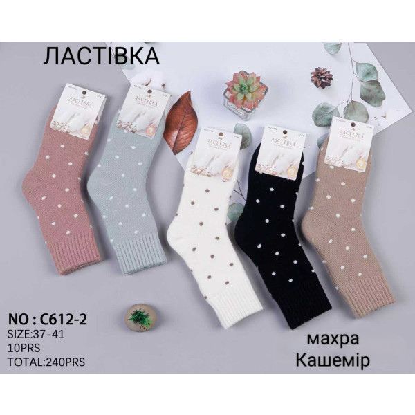 Жіночі зимові шкарпетки Ластівка C612-2 виконані з м’якої махри з додаванням кашеміру. Вони приємні до тіла, добре зберігають тепло та створюють комфорт у холодну пору року. Класичний дизайн із гороховим візерунком. Розмір універсальний — 37–41. В упаковці 10 пар, у мішку 240 пар.