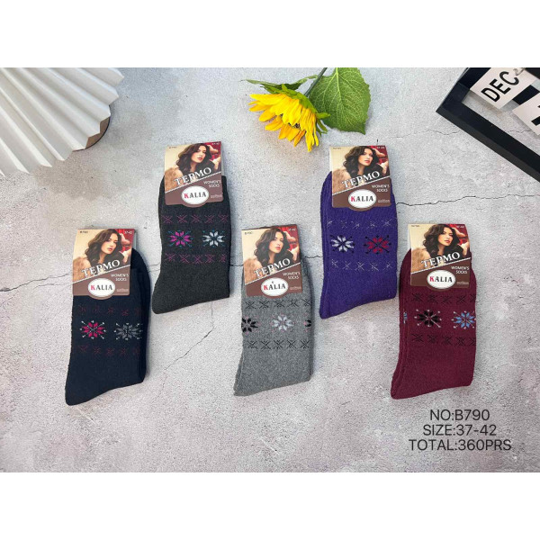 Жіночі термошкарпетки KALIA (Артикул B790). Ці шкарпетки чудово зберігають тепло завдяки спеціальному складу матеріалу та високій посадці. Дизайн включає популярний зимовий принт у вигляді сніжинок та ромбів, що робить їх ідеальними для повсякденного носіння. Розмірний ряд: 37-42 (універсальний). В пачці представлений мікс ходових кольорів. ОПТ: загальна кількість 360 пар.