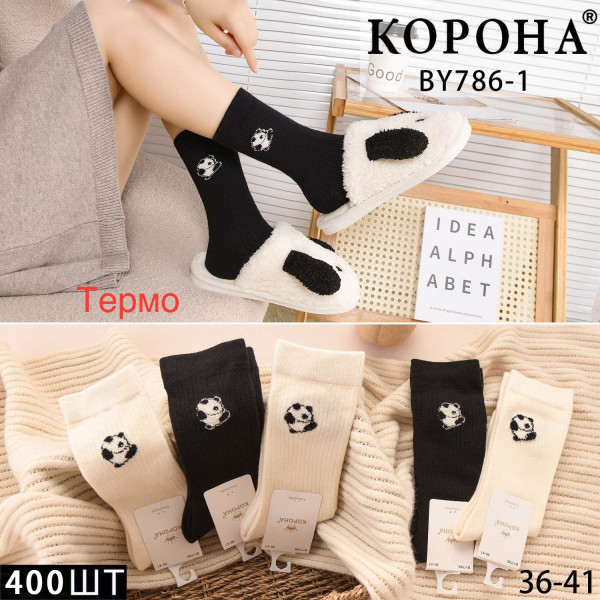 Жіночі термо-шкарпетки КОРОНА BY786-1 з вишивкою «Панда/М’яч». Теплі, зручні. Розмір 36–41. Упаковка — 400 шт.