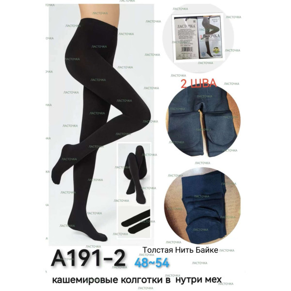 Ластівка A191-2 — це теплі жіночі термоколготки із кашеміру, утеплені м’яким хутром усередині. Завдяки щільній байці вони добре зберігають тепло навіть у сильні морози. Дві бічні шви додають міцності та зручності. Модель еластична, щільна, приємна до тіла, чудово підходить для зими. Розміри норма: 48, 50, 52, 54.