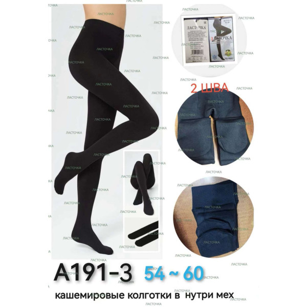 Ластівка A191-3 — теплі жіночі термоколготки з кашеміру, утеплені м’яким хутром усередині. Дві бічні шви забезпечують додаткову міцність та зручність у носінні. Ідеальний варіант для холодної зими: добре тягнуться, щільні, приємні до тіла, не сковують рухів. Батальні розміри: 54, 56, 58, 60.